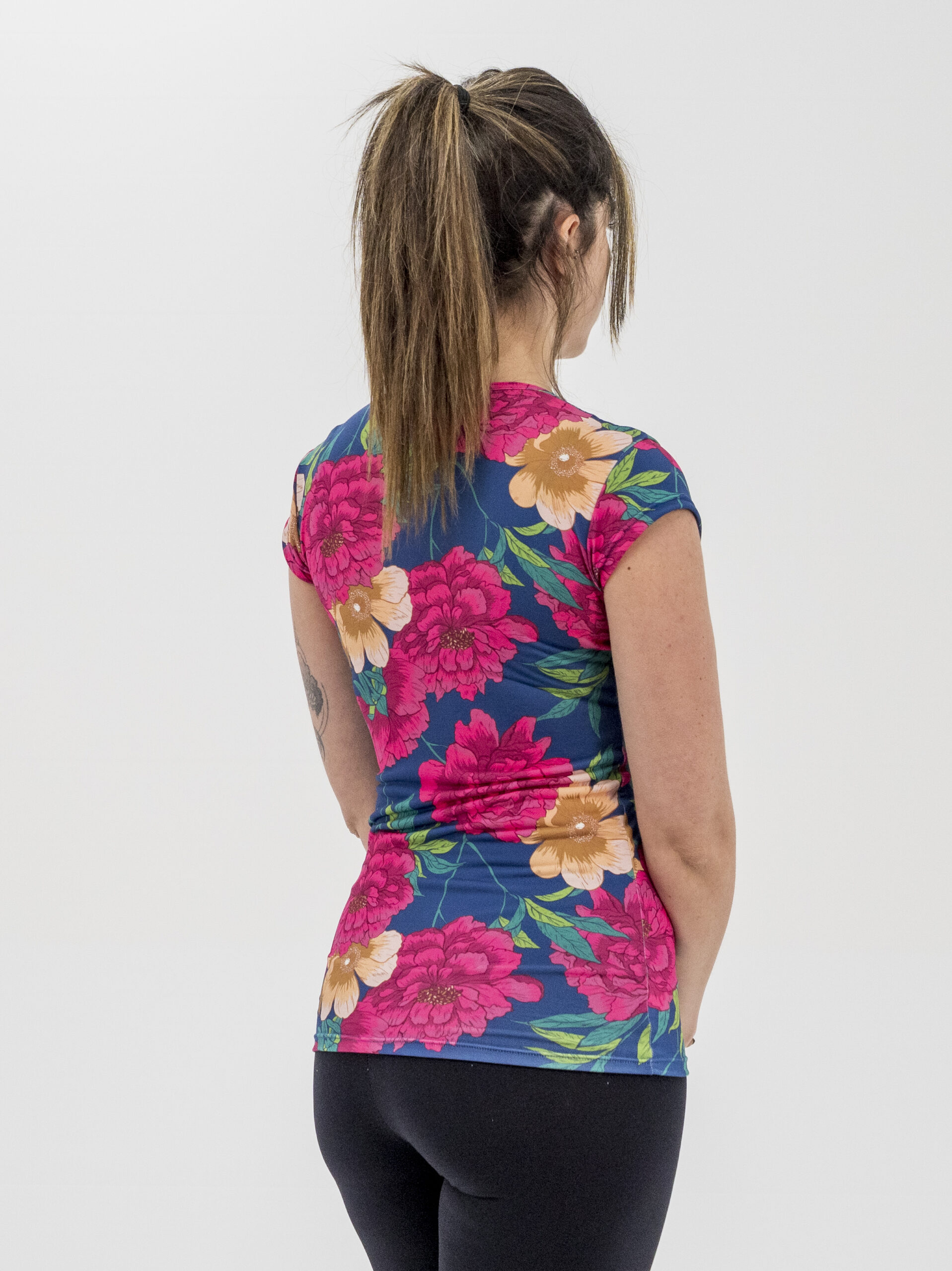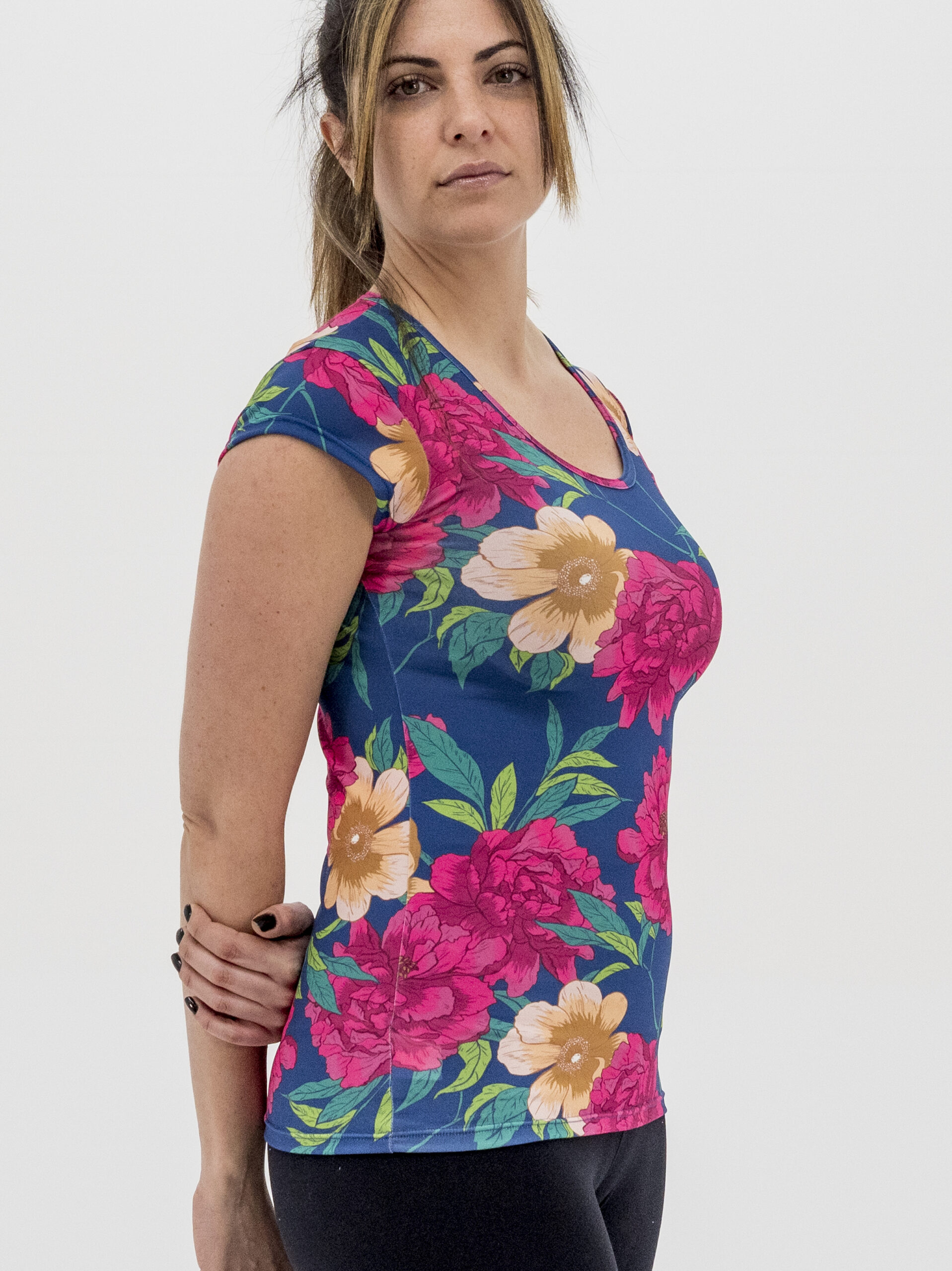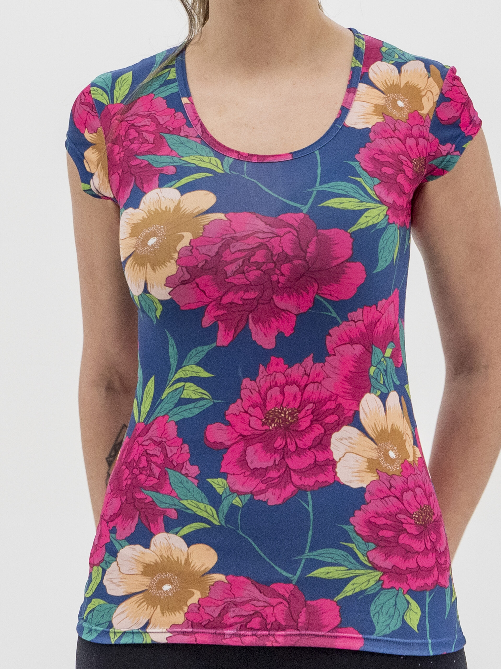 Camiseta ajustada al cuerpo, manga corta, cuello redondo, estampado flores.